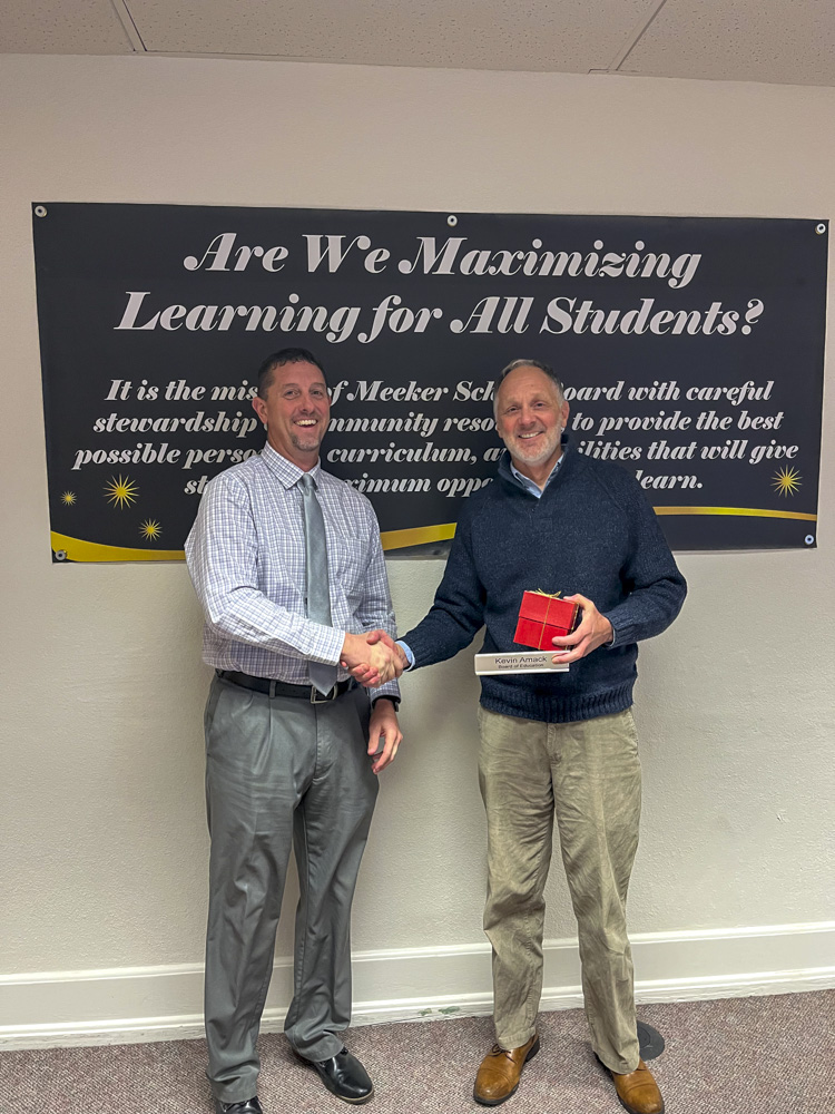 Meeker School District Superintendent Chris Selle presented outgoing school board president Kevin Amack with a gift of appreciation for his service at the Nov. 27 board meeting. Bill deVergie has been nominated and approved as the incoming president of the school board.
