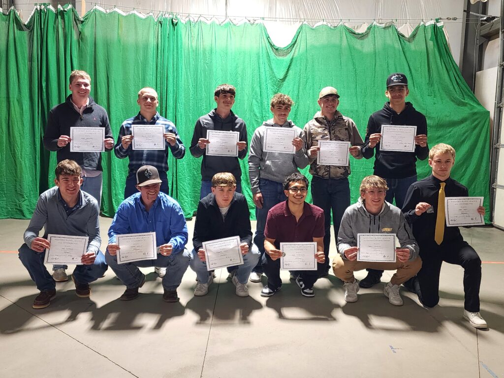 Meeker High School football players recognized as 2025 all-conference selections pose for a photo. Back row, from left: Auggie Halstead, Jonah Christensen, Wesley Thompson, Owen Etchart, Dillon Pretti and Carlos Carrillo. Front row, from left: Sam Conrado, Tristan Rollins, Tucker Chinn, Said Rodriguez, Trent Sanders and Cade Mills.