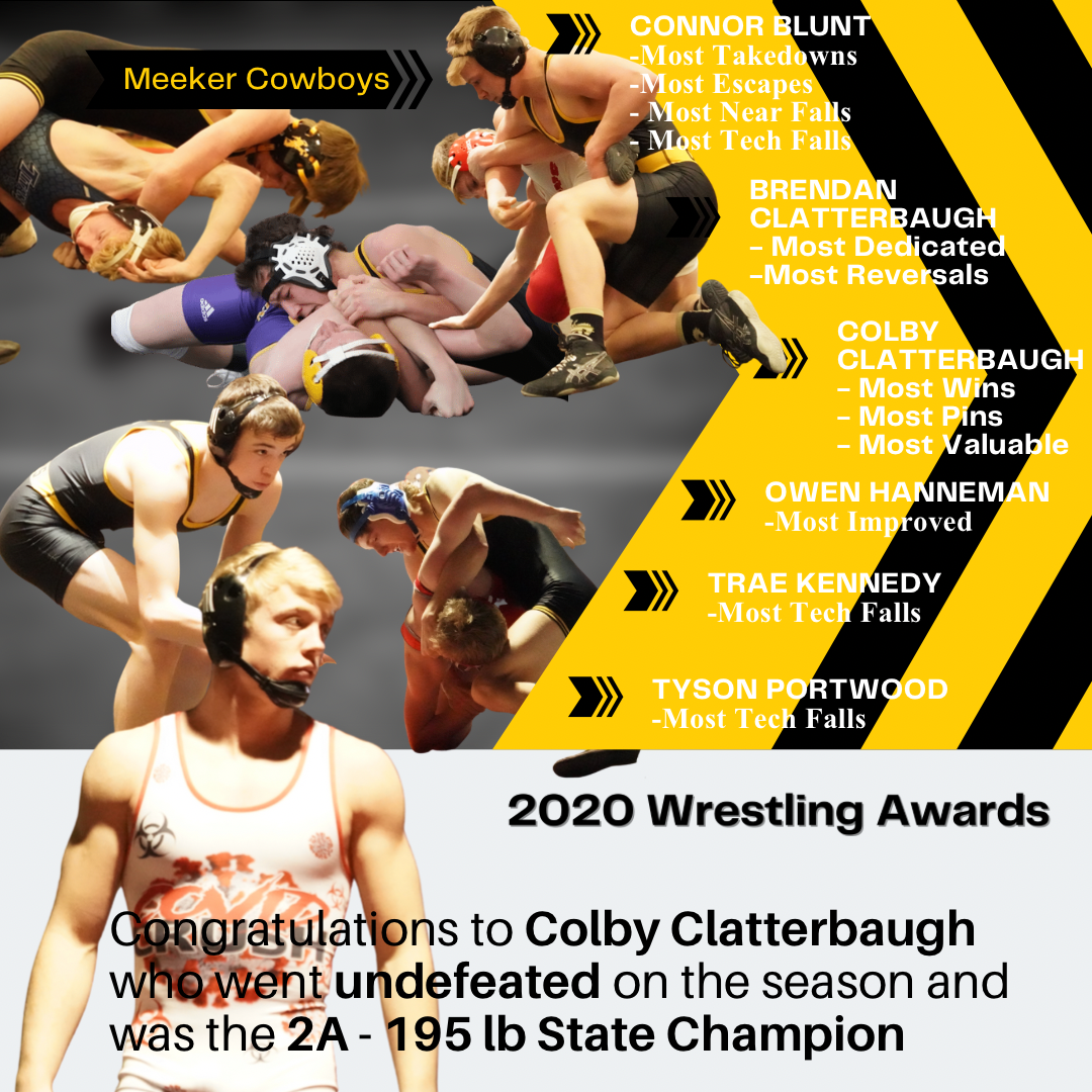 Wrestling awards for the Meeker Cowboys are as follows: Connor Blunt: most takedowns, most escapes, most near falls, most tech fallsBrendan Clatterbaugh: most dedicated, most reversalsColby Clatterbaugh: most wins, most pins, most valuableOwen Hanneman: most improvedTrae Kennedy: most tech fallsTyson Portwood: most tech falls Congratulations to Colby Clatterbaugh, who went[Read More…]