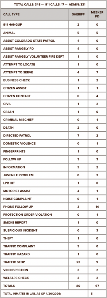 4-18-2026: Rio Blanco County Sheriff’s Office arrested a 47 year-old male on a felony warrant out of Garfield County. He was taken to jail where he remains.