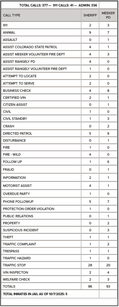10/3/2025 @ 9:03 am. A concerned citizen flagged down a Meeker Police Officer regarding a possible drunk driver. The officer located and stopped the vehicle. It turns out the driver wasn’t drunk, they were simply taking in the views.